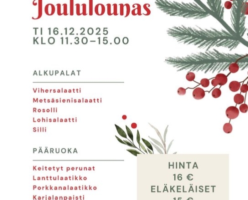Tarjoilemme lounaallamme buffetpöydästä keittoa, runsaasti salaatteja, lämmintä ruokaa, leipää sekä ruokajuomaa. Jälkiruoka sekä kahvia ja teetä.